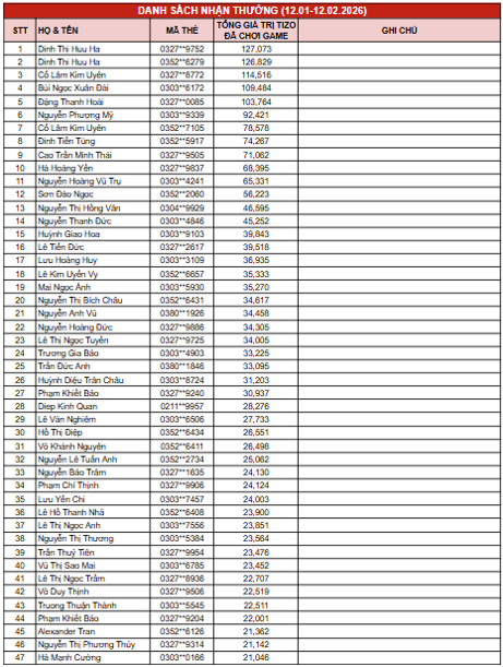 - Thời gian nhận thưởng: Trễ nhất ngày 05.03.2026.