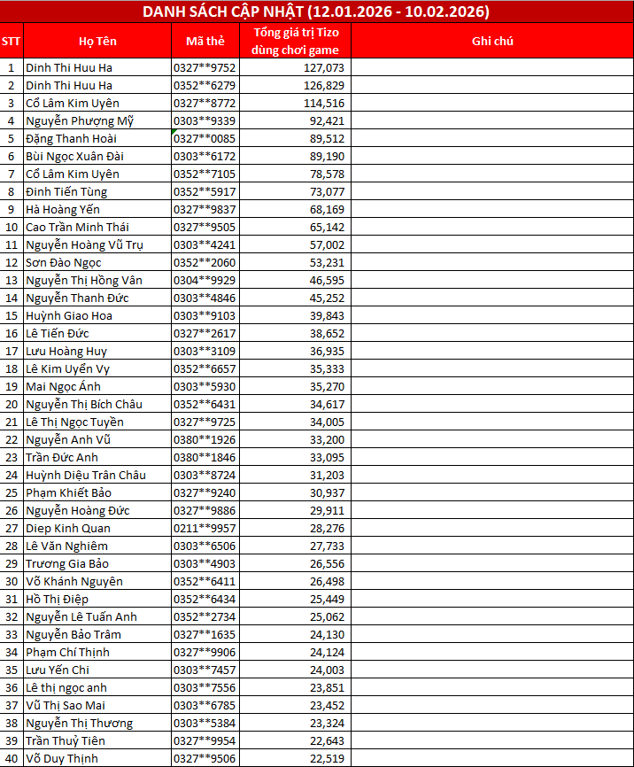 - Trong trường hợp có nhiều mã thẻ có cùng “Giá trị sử dụng Tizo để chơi game” cao nhất, Timezone Vietnam sẽ trao giải thưởng cho 05 mã thẻ đạt mốc sớm nhất, dựa trên thời gian ghi nhận dữ liệu.