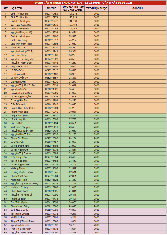 - Thời gian nhận thưởng: Trễ nhất ngày 05.03.2026.