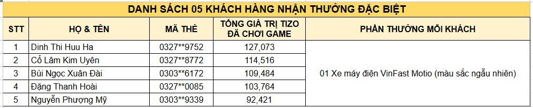 - Top 05 mã thẻ có tổng giá trị Tizo chơi game cao nhất sẽ nhận 01 Xe máy điện VinFast Motio (màu sắc ngẫu nhiên).