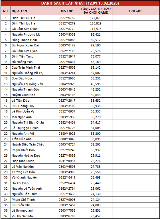 - Giá trị Tizo được sử dụng để chơi game chỉ được tính trên 01 mã thẻ thành viên hợp lệ gắn với CCCD đã đăng ký, không cộng gộp từ nhiều thẻ khác nhau.